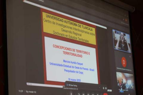 A su vez, el Doctor Marcos Aurelio Saquet, profesor e investigador de la Universidad Estadual de Oeste de Paraná, Brasil, también a distancia, impartió la ponencia .., dirigida a estudiantes y docentes de posgrado del CIISDER. Esta actividad, que se desarrolla en dos sesiones en la Casa de Seminarios, es organizada por el Cuerpo Académico (CA) en Análisis Regional y Estudios Territoriales.
