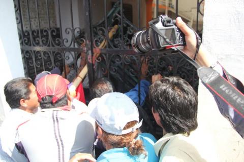 Los hechos ocurrieron por la mañana, cuando más de una centena de profesores pertenecientes a diversas organizaciones magisteriales, intentaron abrir con un serrucho el candado de la puerta de acceso principal, mientras que con el lanzamiento de ladrillos y palos rompieron algunas ventanas.