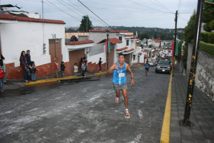 Totolac, Tlaxcala. 15 septiembre. - Luego de haber recorrido las sinuosas calles de la cabecera municipal, el gesto de fatiga de los atletas se tornó en alegría y satisfacción al arribar a la explanada de la presidencia municipal, en donde el público con porras animaba a los esforzados competidores que lograron alcanzar la meta en la justa atlética de Los Cuatro Barrios, celebrada en Totolac.