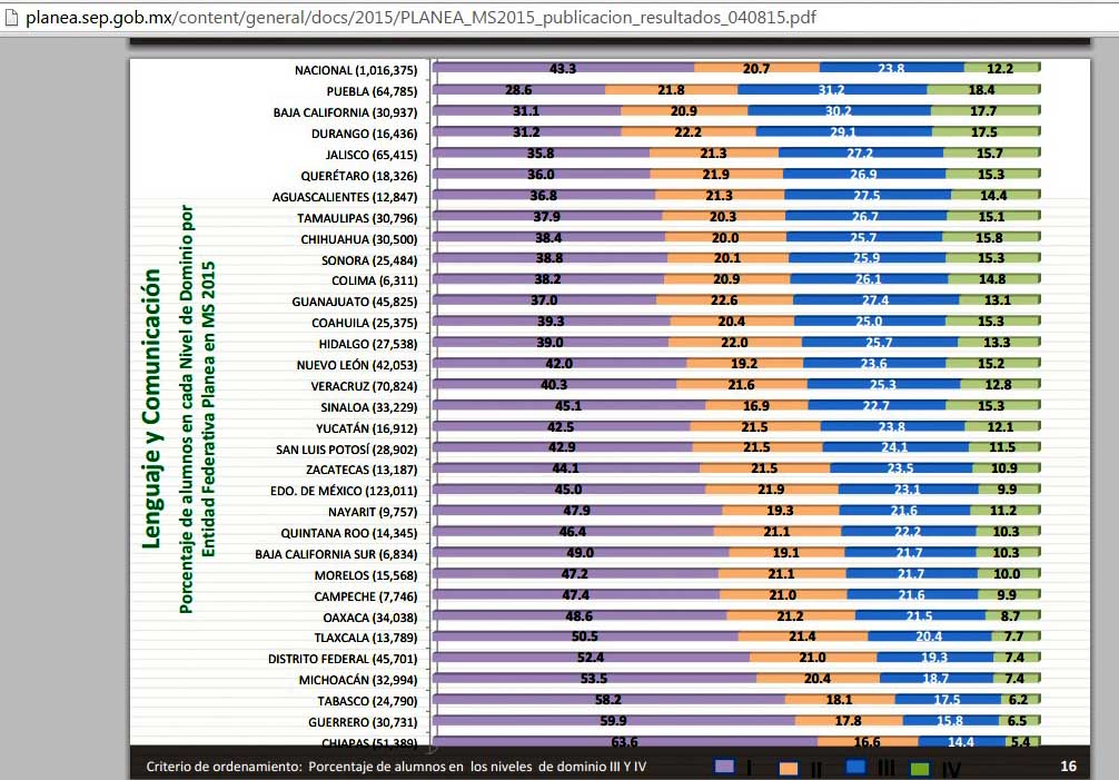 En Lenguaje y Comunicación, el estado se colocó en la sexta peor posición, ya que sólo el 7.7 por ciento de los alumnos dominan los conocimientos y habilidades de esta materia, reconocen elementos estructurales y de contenido; mientras que el 20.4 por ciento dominan los conocimientos para elaborar conclusiones simples; en tanto que el 21.4 por ciento sólo identifican, relacionan y ordenan elementos de información explícitos e implícitos.