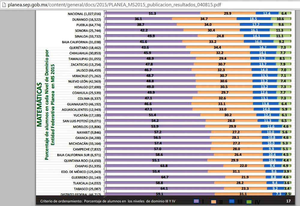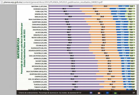 En matemáticas en el mejor nivel por así llamarlo se encuentra sólo el 3.6 por ciento de los estudiantes, mientras que en la segunda etapa está el 9.4 por ciento, en tanto que en el tercer escalón en el que los conocimientos serían sólo suficientes tiene al 28.2 por ciento y en el estrato en donde prácticamente no existe la comprensión del tema se descubre al 58.8 por ciento de los alumnos de planteles de educación media superior.