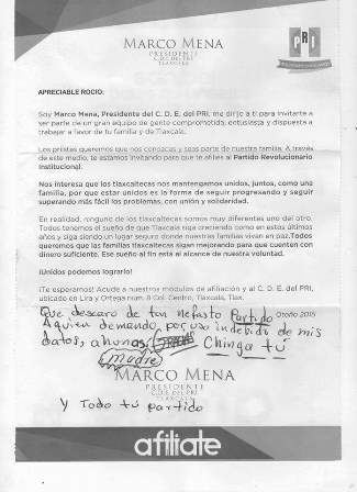 Además de que usuarios de las redes sociales lamentaron que utilicen los datos personales para hacerles llegar propaganda de tipo político, más aún del PRI que aseguran ha traído el peor retroceso para Tlaxcala de la mano de Mariano González y su grupo de "compinches", entre ellos el diputado más improductivo del Congreso, Marco Mena.