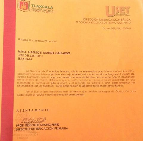 Con la sensibilidad que caracteriza al gobierno del priísta Mariano González Zarur, la Unidad de Servicios Educativos de Tlaxcala (USET) a través de una circular dio a conocer a los jefes de sector para que a su vez hagan lo correspondiente con los directores de primaria que el pago del mes de febrero del Programa Escuelas de Tiempo Completo se efectuará hasta el mes de marzo bajo el argumento de que el presupuesto para este programa es ministrado en dos momentos.