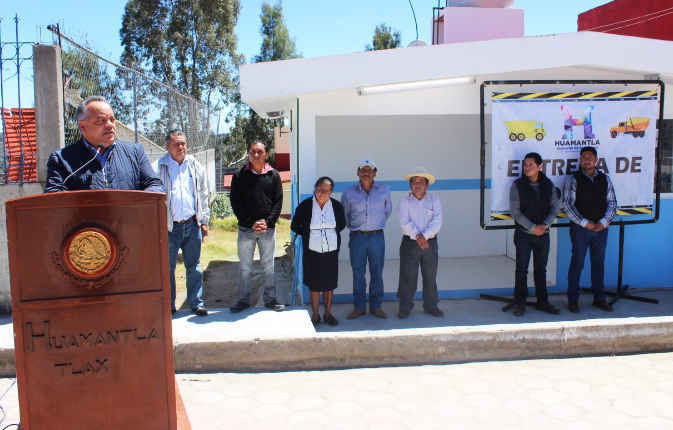 Entrega alcalde obras de agua potable, barda perimetral y trabajos de rehabilitación de  dispensario médico y comedor escolar en comunidad de Huamantla.