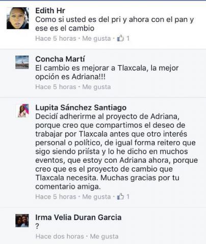 Pese a que encabeza la lista de candidatos a diputados plurinominales del PAN, Guadalupe Sánchez Santiago aclara en las redes sociales que sigue siendo priísta y que sólo apoya el proyecto de Adriana Dávila Fernández para llegar a la gubernatura de Tlaxcala.