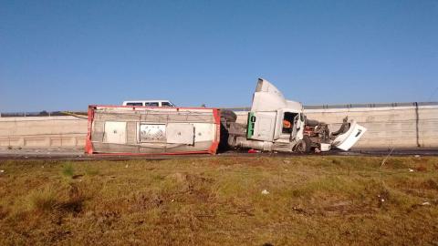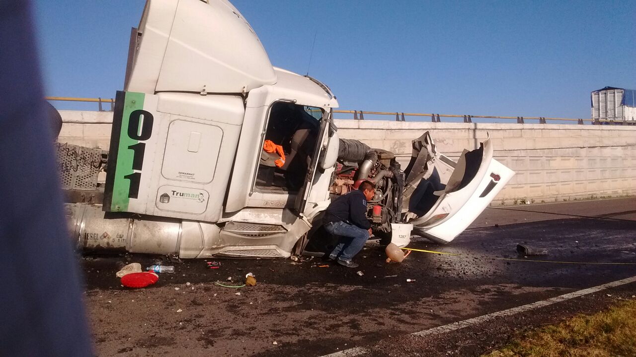Al caer la pesada unidad al piso esta quedó con el motor sobre el suelo y por fortuna en ese momento no iba cruzando ningún vehículo. Al tratar de dar con el chofer del tráiler, nos percatamos que la unidad estaba abandonada solo encontramos un charco de sangre lo que se cree que el responsable va lesionado de consideración.