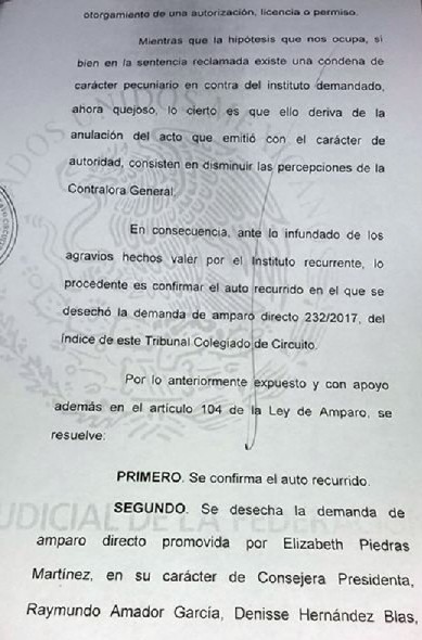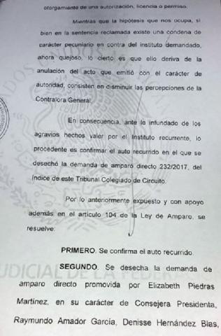 El recurso de reclamación 12/2017 de los consejeros fue desechado al ser improcedente, por lo que deberán reconocer el sueldo de 30 mil 531.08 pesos y no los 16 mil 206.73 pesos que le pagaron en 2016 una vez que le fueron recortadas sus percepciones.