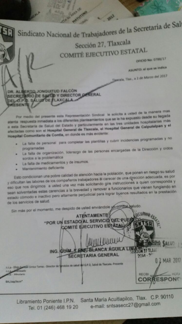 A través de un documento enviado al titular de la Secretaría de Salud (SESA), Alberto Jonguitud Falcón, la dirigente de la sección 27 del Sindicato Nacional de Trabajadores de la Secretaría de Salud (Sntsa), Blanca Águila Lima pretende engañar a la base trabajadora, mostrando ser incongruente, mentirosa y la desesperación debido a que su campaña para reelegirse va en picada y es casi un hecho que perderá la dirigencia sindical.