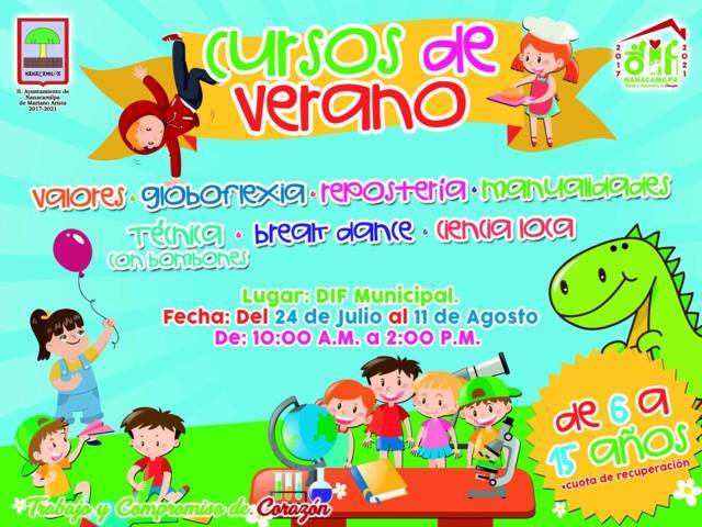 Nanacamilpa de Mariano Arista, Tlax., a 19 de Julio de 2017.- Con el fin de brindar actividades recreativas y educativas a niños y jóvenes de Nanacamilpa, el Sistema Municipal para el Desarrollo Integral de la Familia (SMDIF), presidido por Alicia Analí Rodríguez Pacheco, invita a todo el municipio a inscribirse a los “Cursos de Verano 2017”, que se ofrecerán del 24 de julio al 11 de agosto en las instalaciones del DIF municipal.