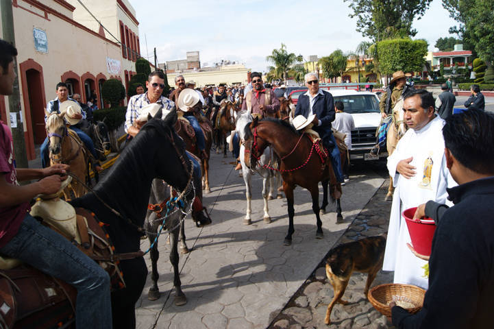 Desde las nueve de la mañana, los jinetes, en su mayoría tlaxquenses, se reúnen en el lienzo charro y comienzan el traslado por la calle principal de Tlaxco, con dirección a la parroquia de San Agustín, ahí, son recibidos por el párroco Martín Zamora Vázquez, quien les da la bendición de la santa iglesia católica.