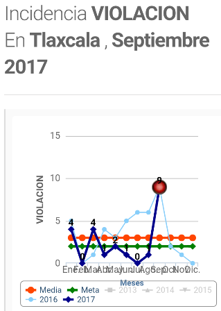Aun cuando ha habido un decremento en el delito de violación con respecto al mismo periodo de 2016, el mes de septiembre fue el que tuvo la cifra más alta en el último año de acuerdo con el Secretariado Ejecutivo del Sistema Nacional de Seguridad Pública (SESNSP).