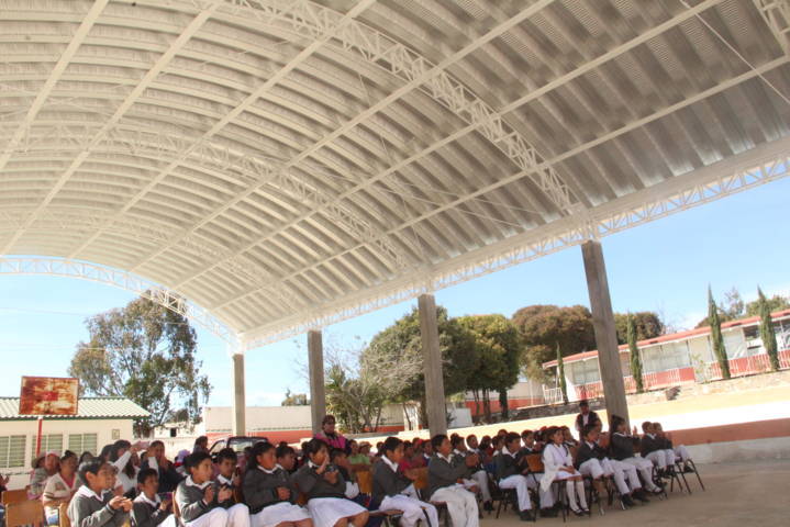 Finalizo diciendo esta techumbre mejorara su calidad de aprendizaje, ya que todas sus actividades que realizaban en el patio cívico ahora las realizaran bajo una sombra, sabemos que esta infraestructura no solamente beneficiara a esta población educativas sino muchas por delante, concluyo León Garfias.