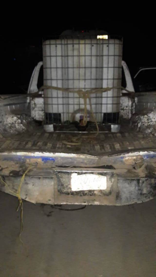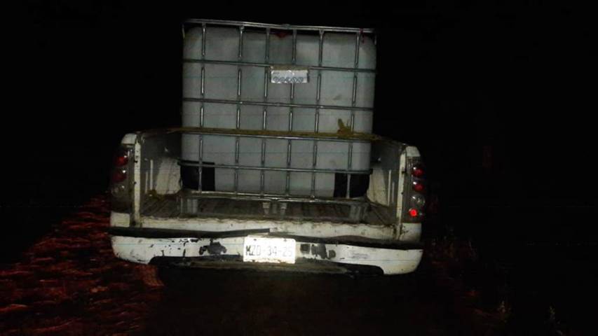 De igual forma, una camioneta marca Chevrolet, tipo Silverado con placas de circulación del Estado de México, la cual cuenta con reporte de robo, al realizar una inspección preventiva, el vehículo abandonado presentaba huellas de desvalijamiento y dos contenedores vacíos en su parte trasera.