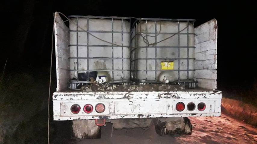 Asimismo, al implementar recorridos pie tierra en zonas aledañas, a unos 300 metros de La Laguna Azul, se ubicó una camioneta marca Chevrolet, tipo C-35, con placas de circulación del Estado de México y cargada con cuatro bidones vacíos, al consultar su estatus, arrojó una alerta de robo mediante el número de emergencias 911, con fecha de junio de 2017.