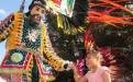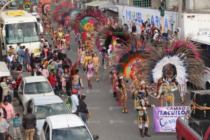 Más de 40 parejas de la camada de Tlacuilohcan iniciaron con el colorido desfile donde familias enteras conocieron los penachos llenos de plumas de diferentes aves y sus trajes llenos de lentejuelas y sus hermosas mujeres que han hecho que esta cuadrilla sobre salga de muchas otras.