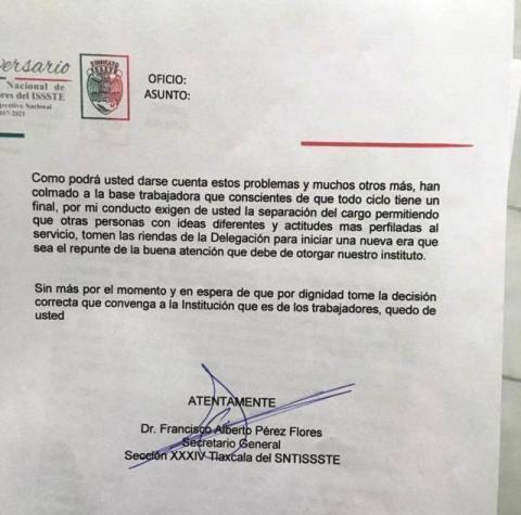 Ante la caída en la atención a los derechohabientes del ISSSTE y la falta de medicamentos producto de una pésima gestión por parte de la encargada de la delegación de esta institución, Perla López Loyo, el dirigente de la sección XXXIV del Sindicato Nacional de Trabajadores del ISSSTE (SNTISSSTE), Francisco Alberto Pérez Flores envió un documento en el que le pide que tenga dignidad y deje de entorpecer las actividades que se presume han costado vidas.