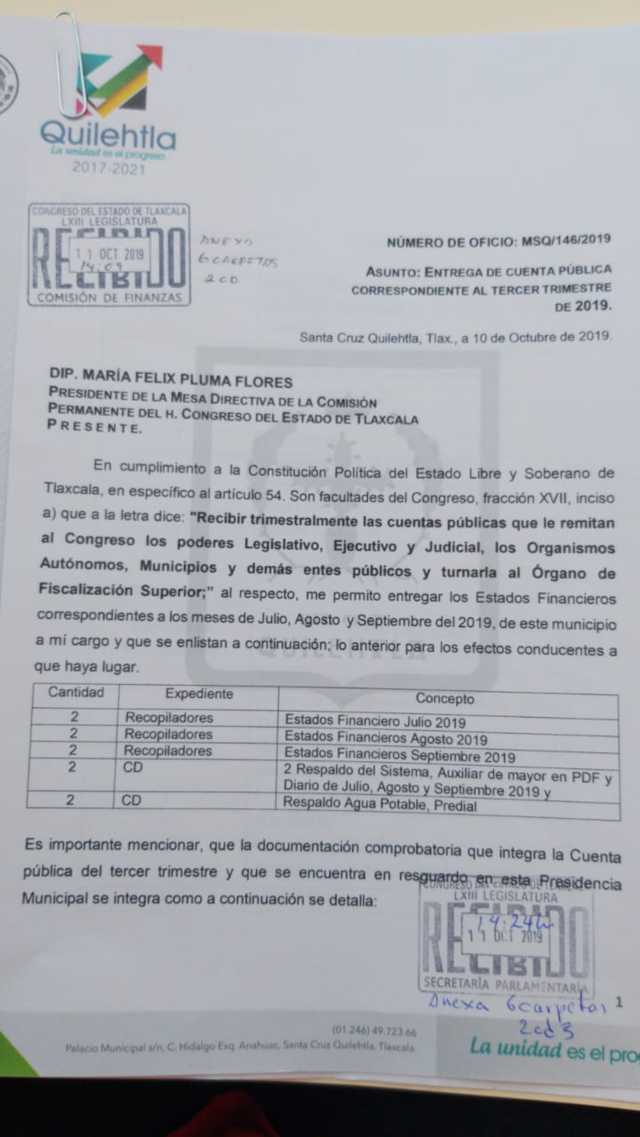 Cabe señalar que el municipio de Quilehtla se encuentra dentro de los primeros cinco municipios en dar cumplimiento a esta obligación.