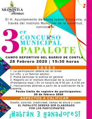 El evento se llevará a cabo el día viernes 28 de febrero de 2020, a las 15:30 horas en el Campo Deportivo del Barrio de Contla, donde se premiarán a los primeros tres lugares conforme a los siguientes aspectos a calificar; diseño, que el papalote sea colorido, creatividad, tiempo de vuelo y altura.