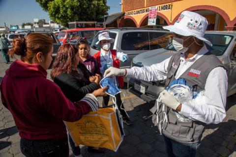 Brigadas de la Coordinación Estatal de Protección Civil (CEPC) y de la Secretaría de Salud (SESA) distribuyeron en los accesos de los centros de abasto de Apizaco, Chiautempan y Zacatelco un total de 7 mil cubrebocas y 50 litros de gel antibacterial entre comerciantes y consumidores