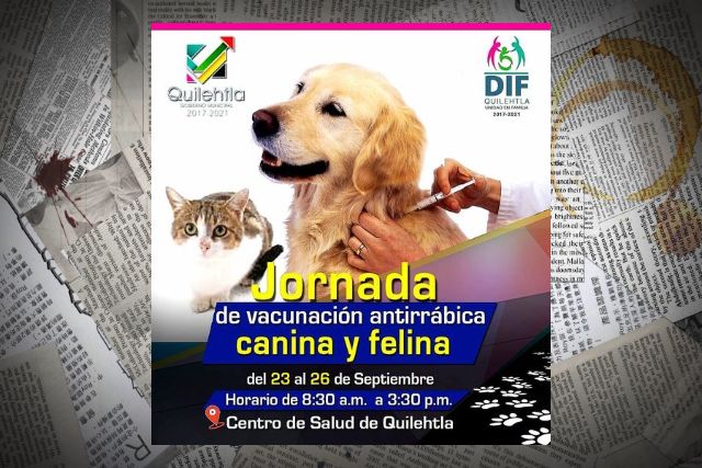 A partir del 23 de septiembre y hasta el 26 del mismo mes, se mantendrá vigente una campaña de vacunación antirrábica canina y felina en el municipio de Santa Cruz Quilehtla.