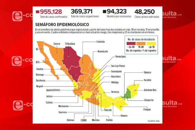 En conferencia de prensa en Palacio Nacional, el funcionario explicó que las entidades que retrocedieron su color e incrementaron su riesgo epidémico fueron: Durango, pasando de naranja a rojo; mientras que Sonora, Sinaloa y Guanajuato cambiaron de amarillo a naranja.
