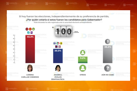 La encuesta que publicó Demoscopia a 100 días de la elección coloca a Lorena Cuéllar con una ventaja de 25 puntos porcentuales sobre Anabell Ávalos, al haber logrado el 45.3 por ciento frente al 20.3 por ciento de la candidata oficialista del gobierno local.