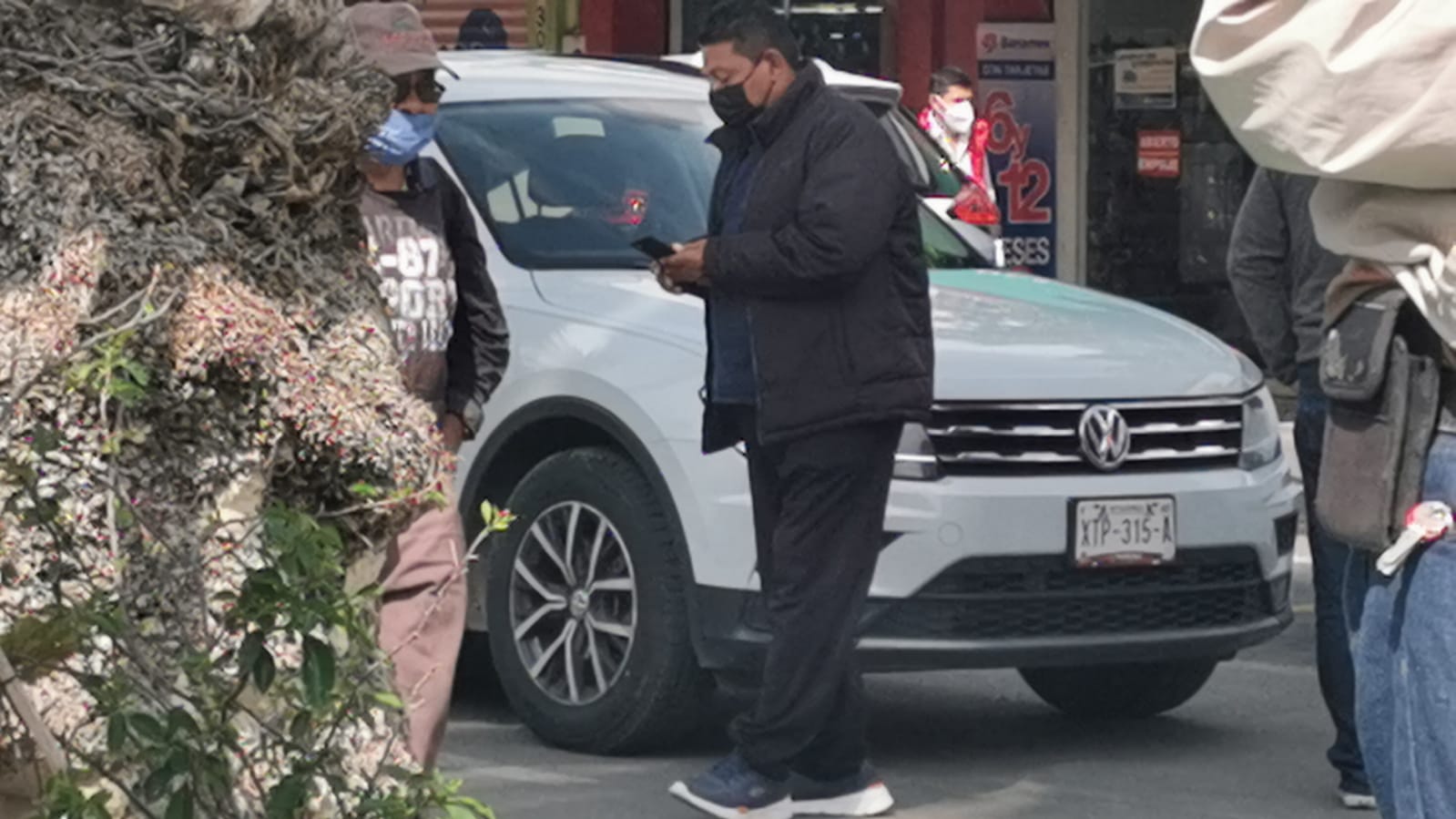 Al mando del comandante Valentin Contreras, policías municipales del Ayuntamiento de Tlaxcala resguardan la camioneta de la candidata "Unidos por Tlaxcala", Anabell Ávalos Zempoalteca.