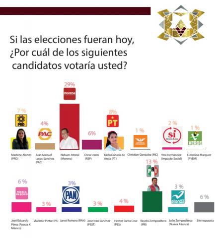 El abanderado morenista mantiene una tendencia a favor con una ventaja de poco más de 15 puntos porcentuales respecto a su más cercano competidor, que es el abanderado del PRI, Ravelo Zempoalteca.