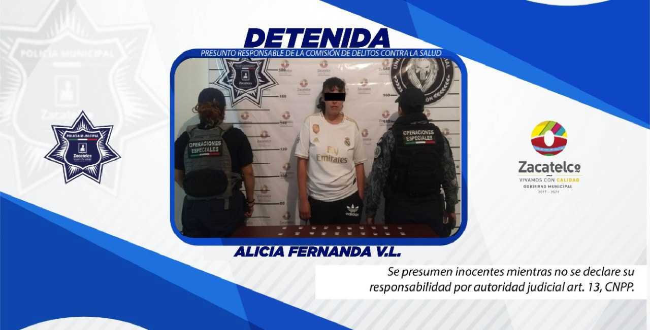 Siendo un hecho delictivo en flagrancia, ya que; la mujer identificada como Alicia Fernanda N., portaba una cantidad aproximada de metanfetamina que excede la dosis máxima de consumo personal e inmediato de acuerdo con el artículo 479 de la Ley General de Salud, fue detenido.