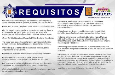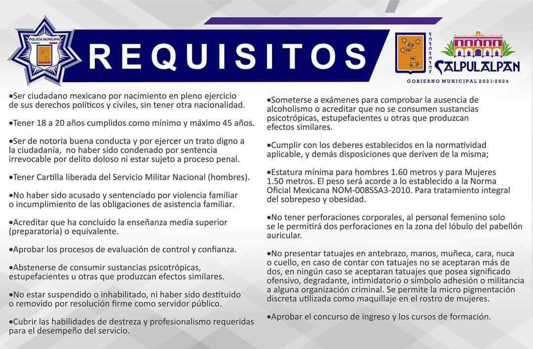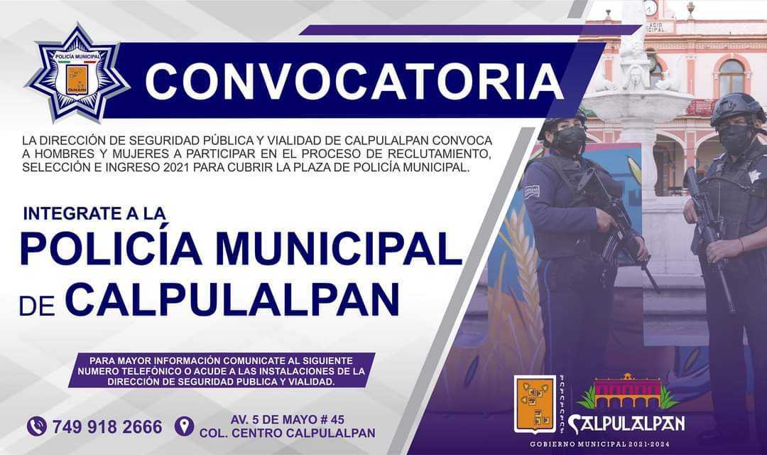 El gobierno municipal de Calpulalpan que encabeza el alcalde Edgar Peña Nájera a través de la Dirección de Seguridad Pública y Vialidad, emitió la convocatoria para el proceso de reclutamiento, selección, formación e ingreso a la coorporación como policía preventivo municipal, con el propósito de dar mejores resultados en el combate frontal a la delincuencia.