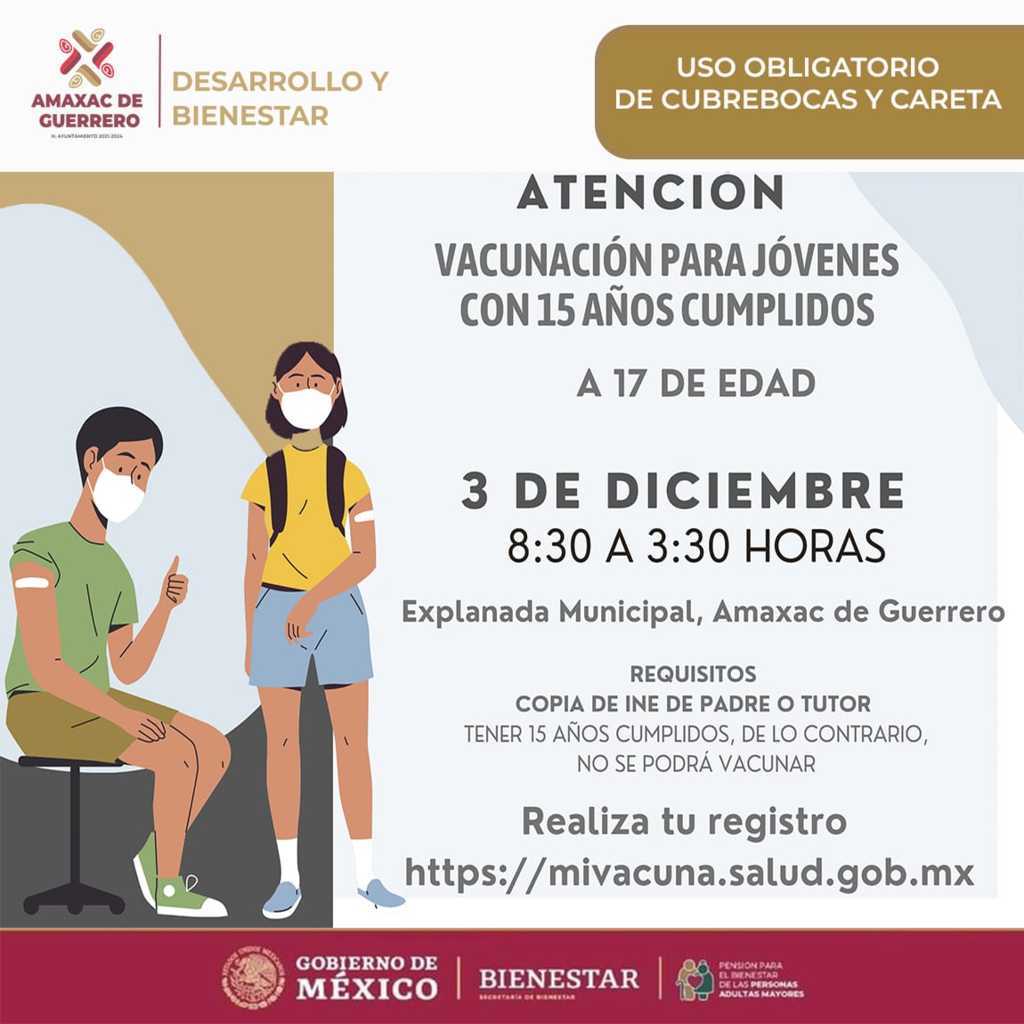 Este viernes 3 de diciembre en la explanada del centro de Amaxac de Guerrero, se realizará la primera dosis de la vacuna contra COVID-19 a adolescentes de entre 15 a 17 años sin comorbilidades.