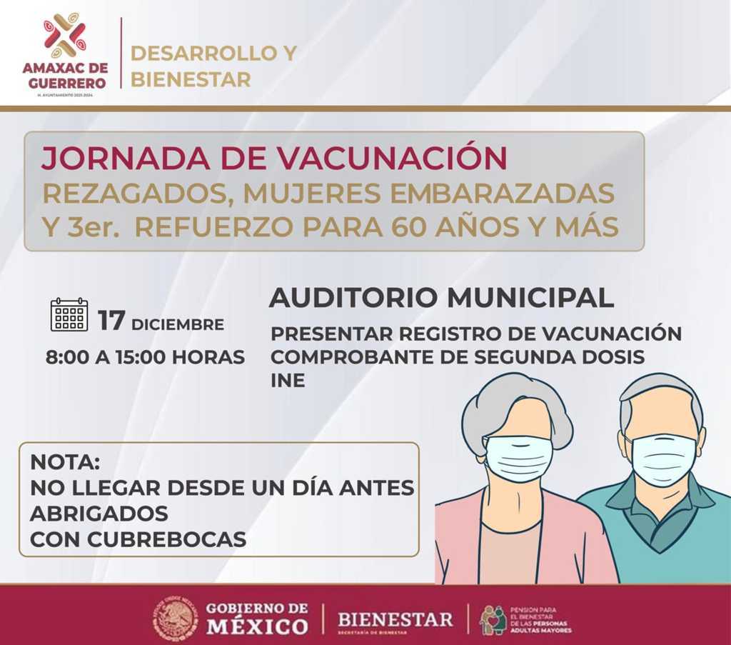 La vacunación de refuerzo para las personas de 60 y más años de edad, llegará al auditorio municipal de Amaxac de Guerrero, este próximo viernes 17 de diciembre; durante esta jornada de vacunación también se aplicarán vacunas a rezagados y a mujeres embarazadas que aún no hayan recibido vacuna en un horario de 8:00 a 15:00 horas.