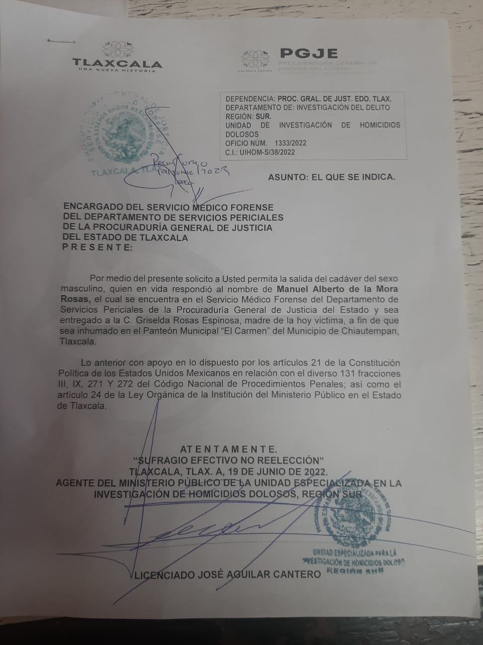 Luego de que fuera ultimado con un proyectil por arma de fuego a la altura del cuello cuando se encontraba en el bar denominado Classico en Chiautempan, familiares de la víctima pidieron mediante un documento a la Procuraduría General de Justicia del Estado (PGJE), que les fuera entregado el cuerpo del hoy occiso para que sea inhumado en el panteón municipal denominado “El Carmen”.