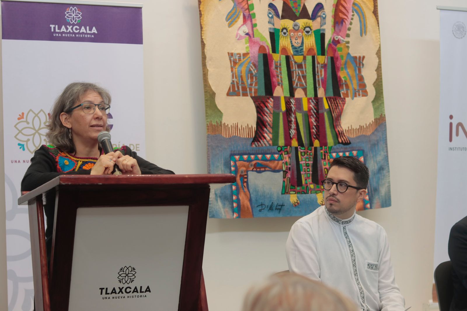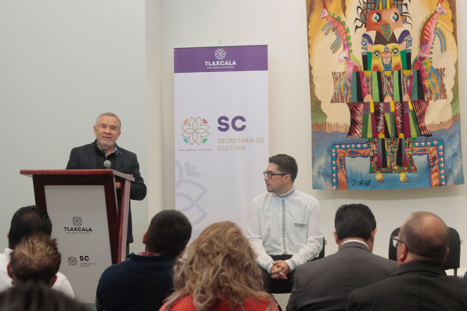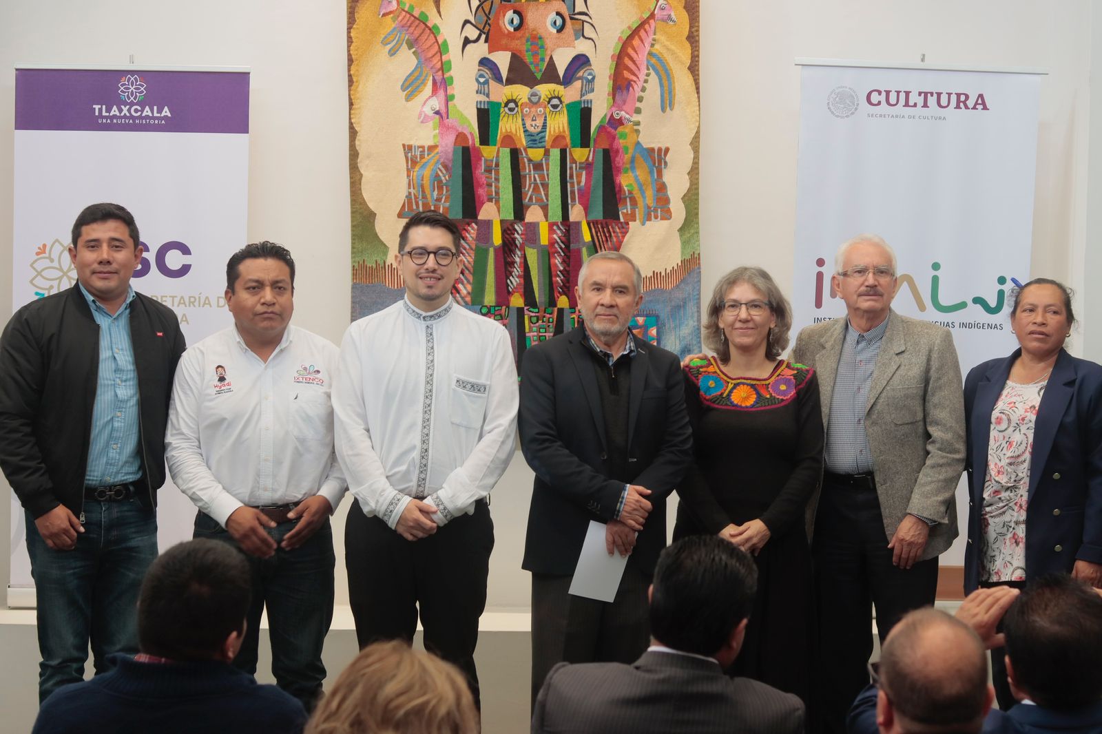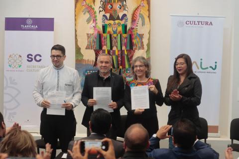 Tlaxcala, Tlax.-29-Noviembre-2022- El secretario de cultura del estado de Tlaxcala, Antonio Martínez Velázquez; el secretario de gobierno, Sergio González, y la Coordinadora General de políticas lingüísticas, Rosa Almandina Cárdenas Demay, realizaron la firma del convenio de colaboración en beneficio de las lenguas indígenas en la entidad.