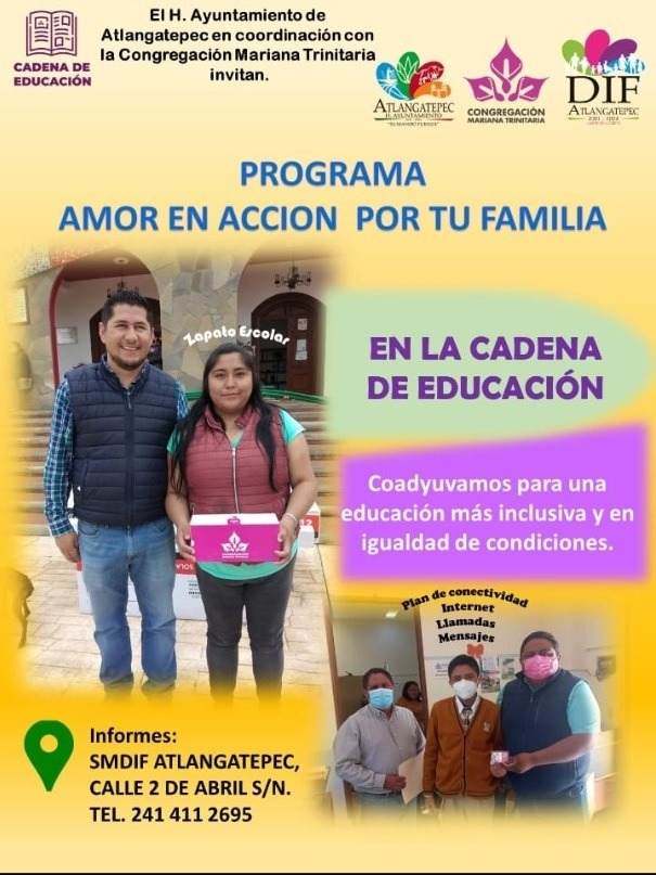 El Ayuntamiento Atlangatepec 2021-2024 , a través del Sistema municipal DIF y del área de desarrollo social en coordinación con la congregación María Trinitaria, pensando en ti y en tu familia te invitan a participar en el programa "Amor en acción por tu familia", con el propósito de coadyuvar a el bienestar de la población más vulnerable.