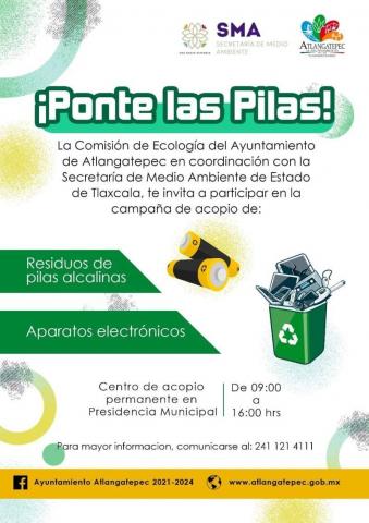 La Comisión de Ecología del Ayuntamiento de Atlangatepec en coordinación con la Secretaría de Medio Ambiente del Estado de Tlaxcala, te invita a participar en el programa de acopio de pilas.