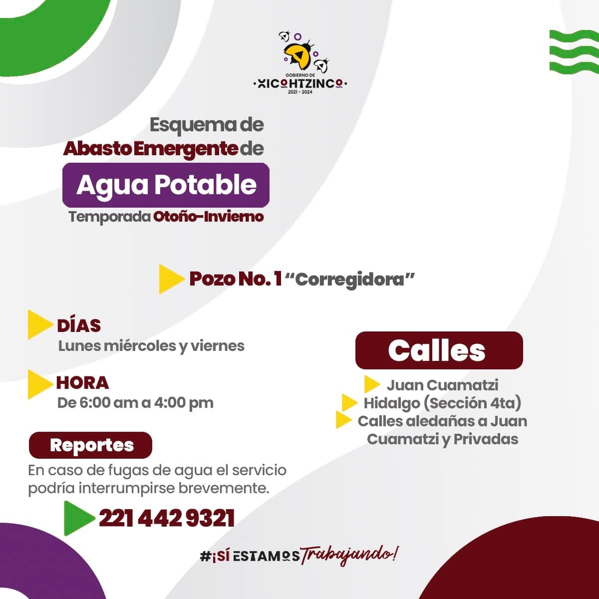 Informarles, que la problemática sobre el abasto de agua, aqueja a muchas partes del estado no solamente a Xicohtzinco, pues nos encontramos en temporada de estiaje, donde el nivel del agua de las zonas de extracción, se encuentra más abajo del nivel normal, por lo que a los equipos de bombeo les cuesta mucho más trabajo llevar el agua a los hogares.