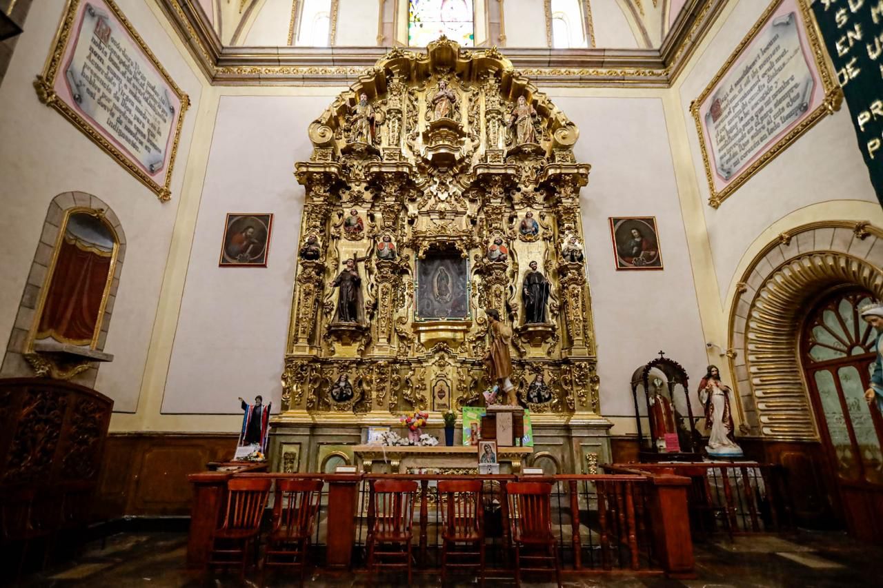 El retablo principal es de espectacular manufactura tallado en madera y laminado en oro con un claro estilo barroco, flanqueado con cuatro columnas estípite.