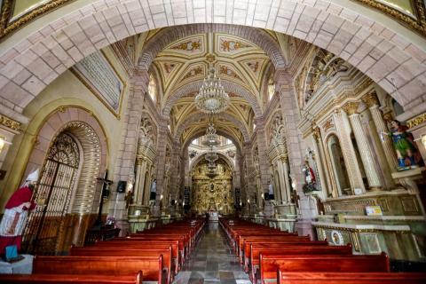 Tlaxcala, Tlax. 31 de enero de 2024. Ubicada en el corazón del pueblo mágico, se encuentra la parroquia de Tlaxco, misma que venera a San Agustín de Hipona; la Iglesia fue construida con cantera rosa, sus retablos principales son de principios del siglo XVIII tallados en madera y laminados en oro, el resto de la decoración de la iglesia se realizó a mediados del siglo XX.