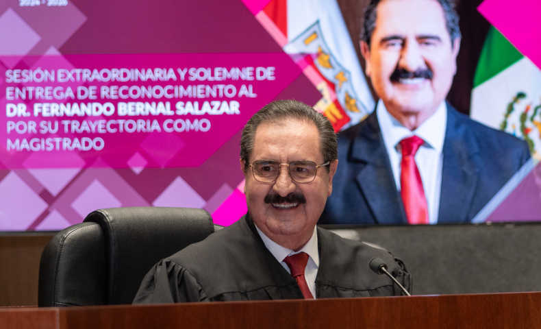 Este día los integrantes del pleno del Tribunal Superior de Justicia en el Estado (TSJE), reconocieron al magistrado Fernando Bernal Salazar, por sus 24 años de trayectoria dentro del Poder Judicial de Tlaxcala, quien el próximo 23 de octubre culminará el segundo periodo para el que fue electo como magistrado propietario, tiempo durante el cual, se condujo con dedicación, compromiso y profesionalismo, motivo por el cual, le fue otorgado también el carácter de Magistrado en Retiro, a partir de que concluya su encargo.