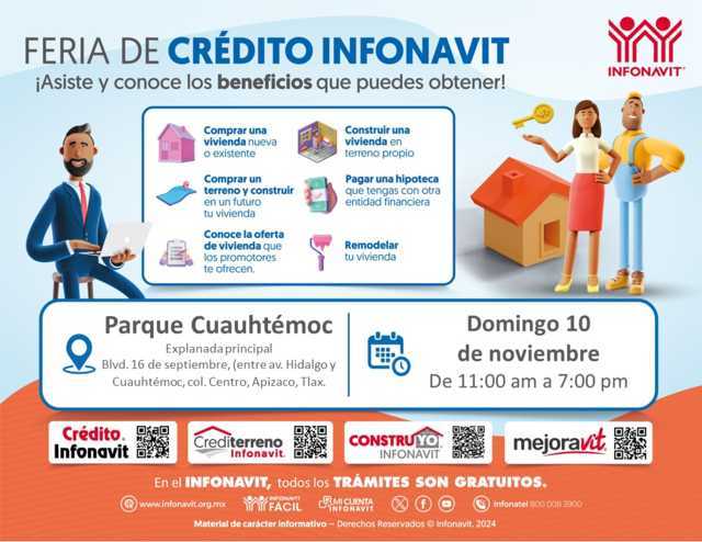 El Instituto del Fondo Nacional de la Vivienda para los Trabajadores (Infonavit) realizará una Feria de Crédito en el municipio de Apizaco, con el objetivo de acercar sus diferentes productos de financiamiento a las y los derechohabientes.