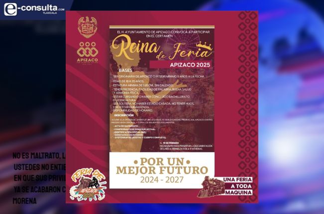EL H. Ayuntamiento de Apizaco, encabezado por el presidente municipal, Javier Rivera Bonilla, invita a todas las jóvenes originarias del municipio de 18 a 25 años de edad, a participar en el certamen para elegir a la Reina de la Feria de Apizaco 2025.