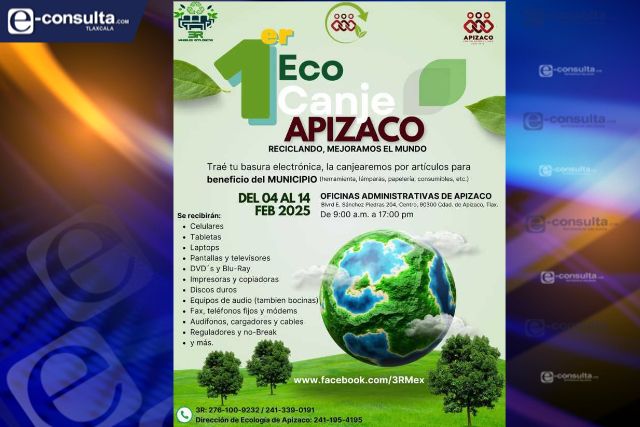 El gobierno municipal encabezado por Javier Rivera Bonilla, invita a la ciudadanía a llevar a canjear sus residuos electrónicos (celulares, tabletas, laptops, pantallas, televisores, DVD’S, Blu-Ray, impresoras, copiadoras, discos duros, equipos de audio, bocinas, fax, teléfonos fijos, módems, audífonos, cargadores, cables, reguladores, etc).