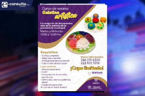 Para fomentar la creatividad y generar oportunidades de emprendimiento entre la población, el Instituto de Capacitación para el Trabajo del Estado de Tlaxcala (Icatlax), con apoyo y en coordinación con la Regiduría de Salud Pública y Desarrollo Social de Papalotla, abrió sus inscripciones para el Curso de Verano de Gelatina Artística, una iniciativa que combina aprendizaje, creatividad y oportunidades de desarrollo personal.