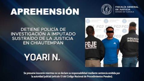 La Policía de Investigación de la Fiscalía General de Justicia del Estado (FGJE) cumplimentó una orden de aprehensión en contra de Yoari N., quien fue declarado sustraído de la acción de la justicia por no presentarse a diversas audiencias, a pesar de haber sido debidamente notificado dentro del proceso que enfrenta por el delito de robo calificado.