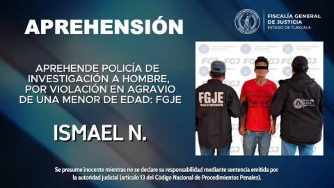 La Policía de Investigación de la Fiscalía General de Justicia del Estado (FGJE) logró la aprehensión de Ismael N., por su probable responsabilidad en el delito de violación en perjuicio de una menor de edad, en el municipio de Yauhquemehcan.
