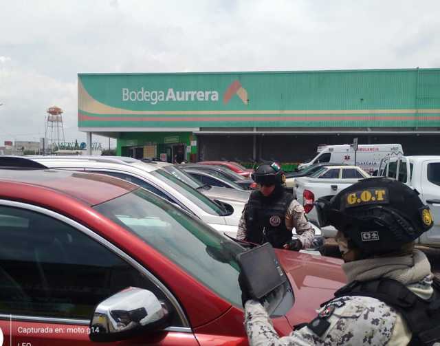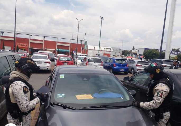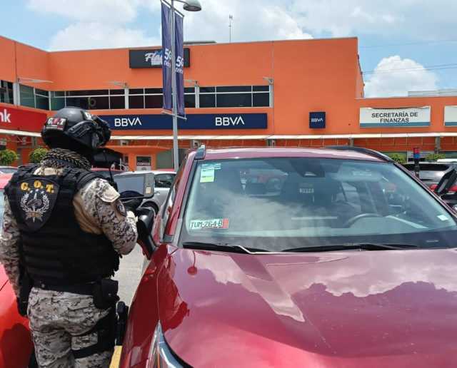 Los elementos realizan inspecciones en estacionamientos de centros comerciales, apoyados con tecnología del dispositivo “Arco Móvil”, el cual permite escanear números de serie, placas y chips electrónicos en tiempo real.