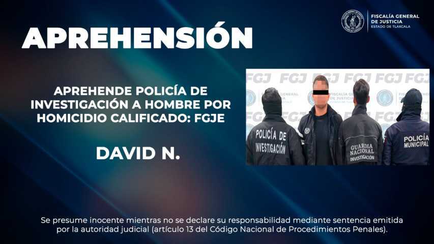 Elementos de la Policía de Investigación de la Fiscalía General de Justicia del Estado (FGJE) lograron la aprehensión de David N., por el delito de homicidio calificado, hecho ocurrido en el municipio de Tzompantepec.