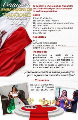 Las jóvenes interesadas en representar la belleza, alegría y tradiciones del municipio de Papalotla aún tienen oportunidad de participar en el certamen "Embajadora de las Tradiciones Papalotla 2025", ya que las inscripciones permanecen abiertas hasta el próximo 29 de agosto.