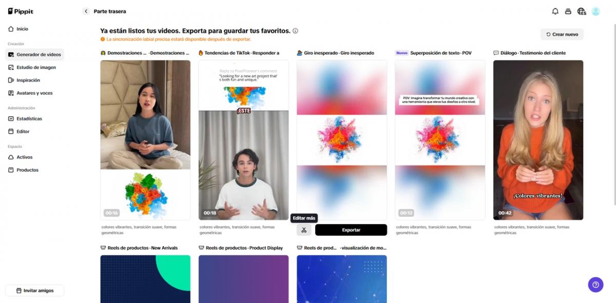 Además de la corrección de color, Pippit ofrece una amplia gama de herramientas para perfeccionar tus videos. Puedes añadir música de fondo, subtítulos y avatares para mejorar la interacción. La plataforma también incluye funciones para eliminar fondos y agregar superposiciones creativas, lo que permite una edición versátil. Puedes crear avatares que representen tu marca o mensaje, haciéndolo más personal. Estos avatares pueden hablar en varios idiomas y adaptarse a diferentes públicos. Una vez finalizada la edición, puedes exportar el video en distintos formatos para TikTok, Instagram, YouTube o reuniones de trabajo.